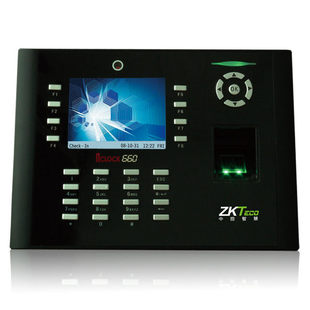 iClock660是中控科技繼2.4寸彩屏門禁、3.5寸彩屏考勤和8寸彩屏考勤產品推出近兩年的時間又推出的一款3.5寸彩屏指紋考勤機,該款產品在原來3.5寸彩屏考勤產品的基礎上增加了攝像頭拍照功能,內置130萬像素高清攝像頭,可以輕松實現員工照片拍攝和顯示,標準的TCP/IP通訊,經過USB-IF協會認證的U盤下載和Client模式通訊,方便得T9輸入法,對公對私的短消息功能、用戶可自定義的定時響鈴和其高貴典雅的外觀設計,適合100-500人考勤管理
