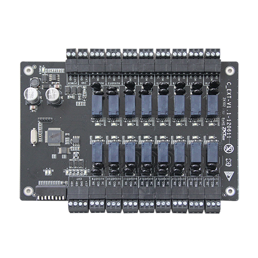 ? EX-16擴展板的信息處理是經過主控EC-100來進行傳輸 ? EX-16擴展板和主控器EC-100之前的通訊是通過RS485傳輸 ? EXT-16擴展板(16路繼電器輸出),它與EC100電梯控制器配套使用,通過RS485和EC100通信, ? 一個EC100最多可連接3個EX-16,最大可以控制58層電梯,輸出繼電器開關量信號,使用簡單,維護方便。
